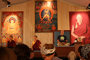 Lama Ole Nydahl, H.H. Sakya Trinzin, and Lama Jampa Thaye at the Kalachakra-Empowerment in London on the 14th of June 2010