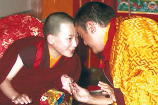 Shamar Rinpoche introduces the 17th Karmapa Karmapa Trinley Thaye Dorje in New Delhi in 1994.