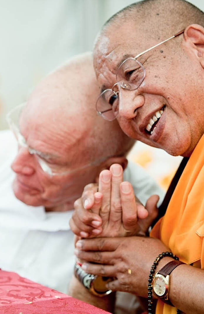 Lopon Tsechu Rinpoche was born in Buthan in 1918 where he was closely associated with the Bhutanese royal family. The 16th Gyalwa karmapa became one of his most important teachers. Due to his intense activity over several decades, Rinpoche was seen as one of the key figures in the cohesion of the different Buddhist schools in Nepal and the whole Himalayan region. Lama Ole Nydahl and Hannah met him on their first trip to the East in 1969. From 1987 onwards he regularly visited the Diamond Way centers which Hannah and Ole founded. He built 17 stupas in the West, the biggest of which is the Enlightenment Stupa near Malaga in Spain being 33m high. He also accompanied the 17th Gyalwa Karmapa on his first European visit in 2000.